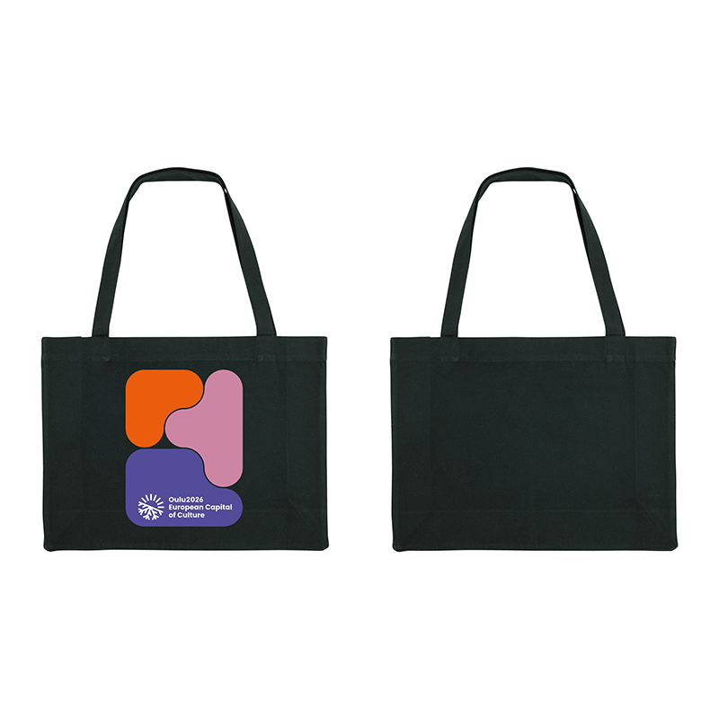 Värikäs Oulu2026-muotografiikka ja logopainatus edessä.