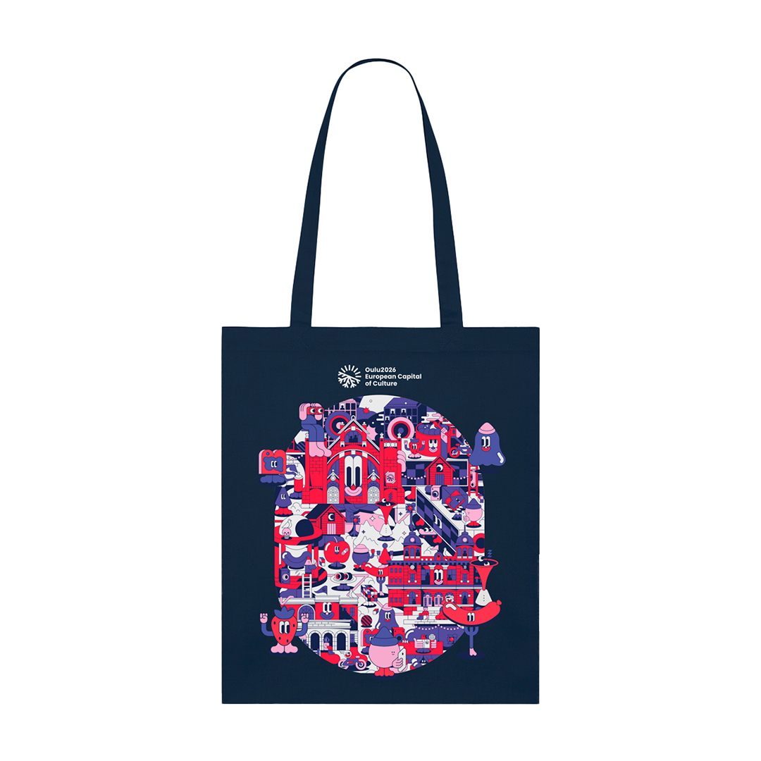 Edessä ilmeikäs Oulu-aiheinen painatus, joka on kuvittaja Jari Johanneksen käsialaa.