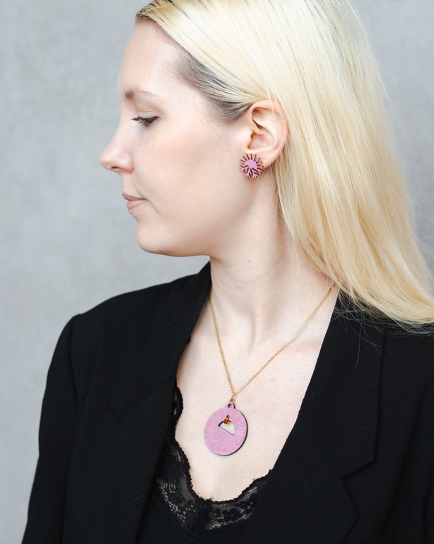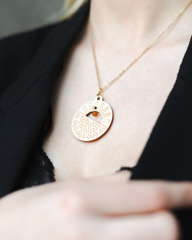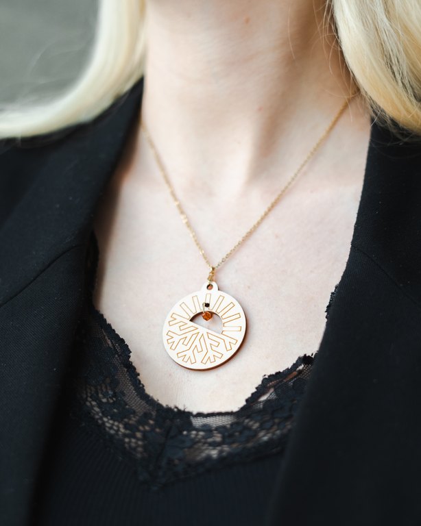 Kevyt Oulu2026-kaulakoru on valmistettu kotimaisesta koivuvanerista, ja sen ketju on kultapinnoitettua kirurginterästä. Korun keskellä lasihelmi. Värivaihtoehtoina koivu ja vaaleanpunainen.