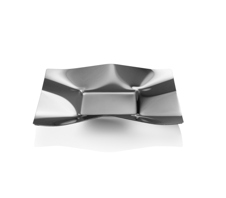 Made from durable stainless steel, this timeless plate is designed locally, and is suitable for versatile use. The plate bottom is engraved with Oulu2026. Dimensions: 15 cm × 15 cm. The product comes in a small package.  holds an engraved with “Oulu2026” on the bottom.